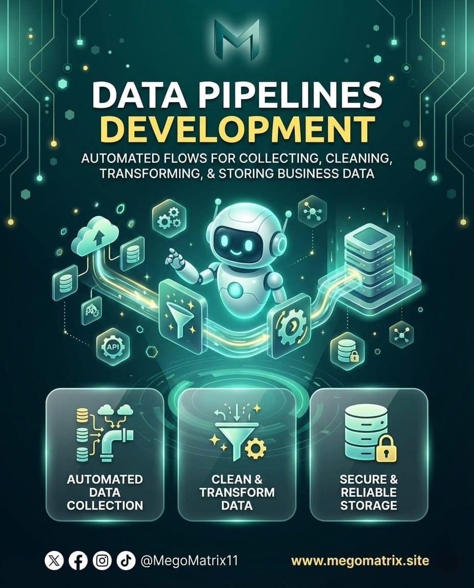Automated data pipelines for collecting, cleaning, transforming, and storing business data.